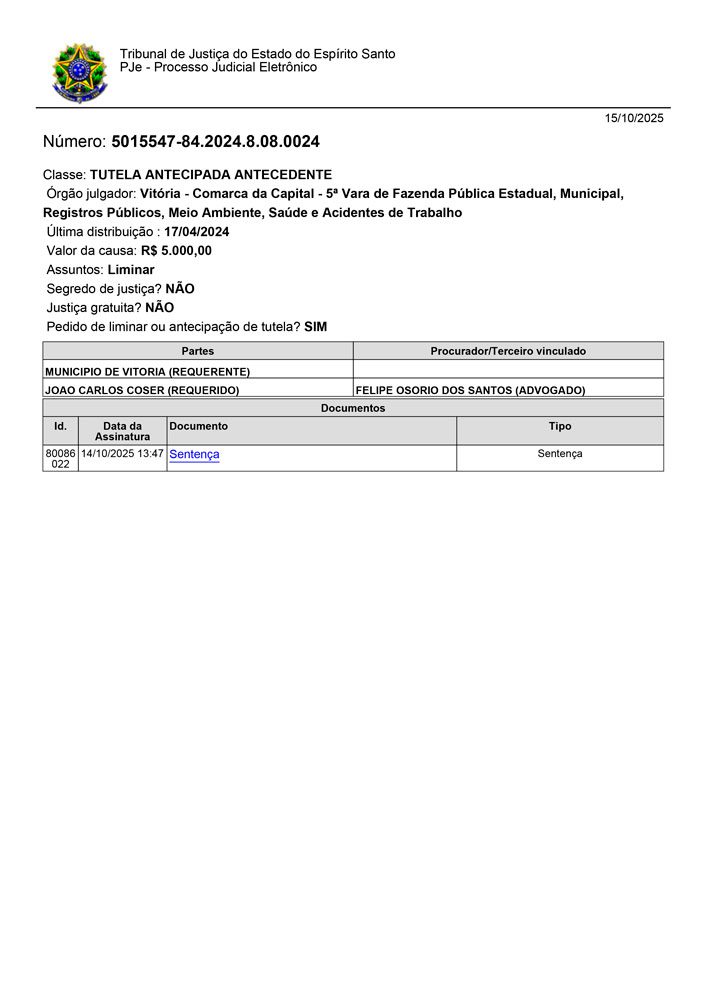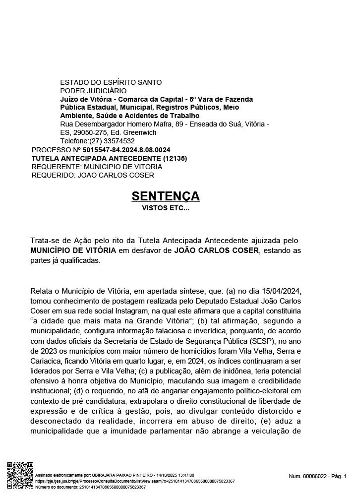 A Justiça do Espírito Santo condenou o deputado estadual João Carlos Coser a publicar retratação pública em sua conta no Instagram após afirmar, em abril de 2024, que Vitória seria “a cidade que mais mata na Grande Vitória”.