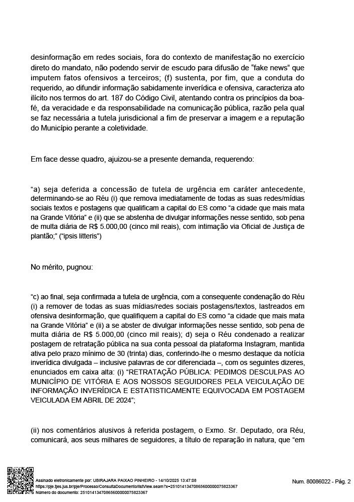 - Remova de todas as redes sociais postagens que qualifiquem Vitória como “a cidade que mais mata na Grande Vitória”;