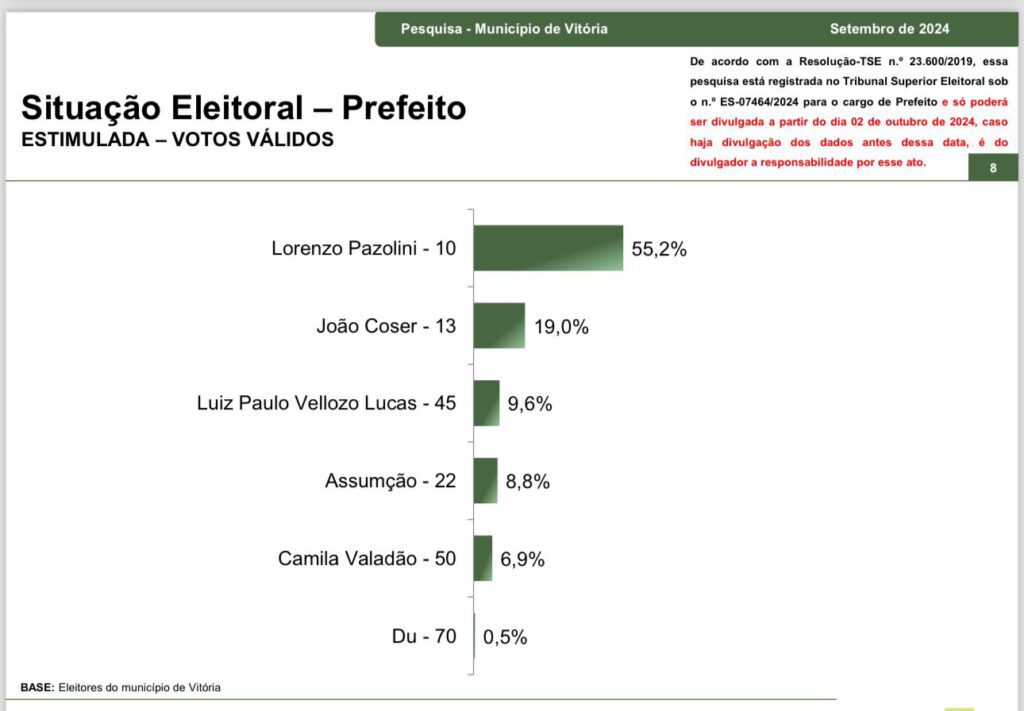 A mais recente, do Paraná Pesquisas, divulgada nesta quarta-feira (2), traz que Pazolini tem 55,2% dos votos válidos, contra 19% de João Coser (PT), 9,6% de Luiz Paulo Velloso Lucas (PSDB), 8,8% de Assumção (PL), 6,9% de Camila Valadão (PSOL) e 0,5% de Du (Avante). A pesquisa foi realizada entre os dias 28 de setembro a 1º de outubro com 800 eleitores. O grau de confiança é de 95,0% para uma margem estimada de erro de aproximadamente 3,5 pontos percentuais para os resultados gerais. O levantamento está registrado no TSE com o nº ES-07464/2024.