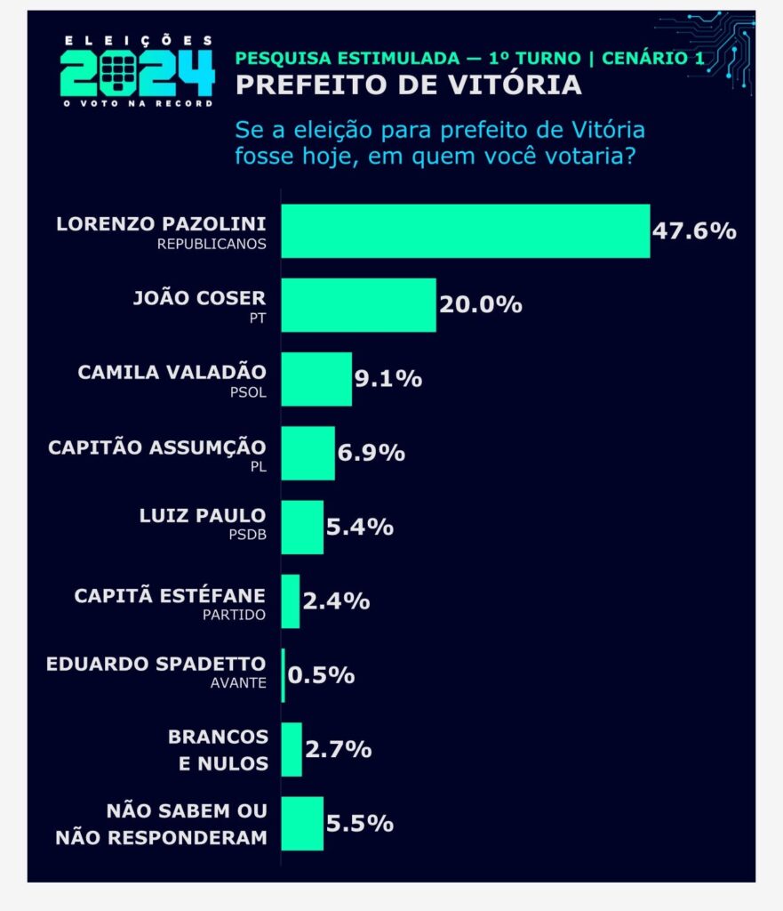 Nova pesquisa para o pleito municipal deste ano, publicada pela Rede Vitória na manhã desta segunda-feira (01), aponta que o atual prefeito de Vitória, Lorenzo Pazolini (Republicanos), é franco favorito à reeleição no primeiro turno das eleições, com 47,6% das intenções de voto. Este é o segundo levantamento da Futura no projeto 100% Cidades que traz que o atual chefe do Executivo municipal de Vitória na preferência popular.