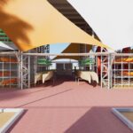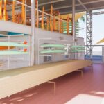 A fachada será revestida com lonas, com cores que remetem ao nascer do sol. O piso intertravado irá delimitar áreas de circulação e de armazenamento.